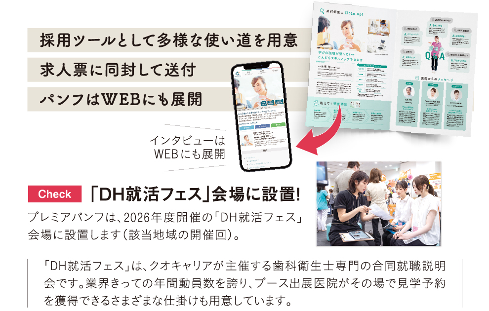 紙・WEB展開の「共感型採用強化ツール」 - プロカメラマンとライターが貴院を訪問し、在籍DHにインタビュー。編集した原稿は「プレミアパンフ」とWEBメディア「R/Leadme」の2つのメディアで展開します。先輩DHの仕事に対する想い、活躍する姿を発信することで、求職者に貴院で働く未来をイメージさせられます。